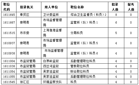 截至17日17時,2016上海公務(wù)員考試第一輪職位報(bào)名仍有349個職位無一人申報(bào),可謂門前凄涼,其中有十個招錄人數(shù)在4人及以上的職位無人問津。其中缺口的是市監(jiān)獄管理局,目前還有34個職位、64人的空缺,希望符合條件的考生能重點(diǎn)考慮這些職位,因?yàn)檫@些空缺意味著更大的機(jī)會。以下是招錄人數(shù)較多但無人申報(bào)的職位,供考生參考: