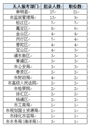 截止到19日18時報名結束,共有83個職位無人申報,占總職位數(shù)的4.9%,與去年同期基本持平。據(jù)中公網(wǎng)校統(tǒng)計,崇明縣無人申報職位最多,有21個職位無人申報,另外,市監(jiān)獄管理局、松江區(qū)、嘉定區(qū)等無人報考職位也較多。以下是各部門無人報考情況一覽: