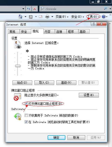 為了報(bào)名操作能夠順利進(jìn)行,請使用IE瀏覽器(Internet Explorer)。調(diào)整瀏覽器屬性,關(guān)閉彈出窗口阻止程序:打開瀏覽器,在“工具”菜單的“Internet選項(xiàng)”中選擇“隱私”選項(xiàng)卡,將“打開彈出窗口阻止程序”前面的勾取消,然后點(diǎn)【應(yīng)用】。