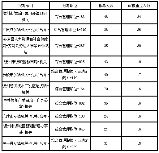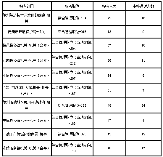 截止3月24日17:00,德州公務(wù)員考試報(bào)考部門人數(shù)最多的崗位依次為:德州經(jīng)濟(jì)技術(shù)開(kāi)發(fā)區(qū)趙虎鎮(zhèn)、德州市環(huán)境保護(hù)局、臨邑縣鄉(xiāng)鎮(zhèn)機(jī)關(guān)、武城縣鄉(xiāng)鎮(zhèn)機(jī)關(guān)、平原縣鄉(xiāng)鎮(zhèn)機(jī)關(guān)、德州市陵城區(qū)鄉(xiāng)鎮(zhèn)機(jī)關(guān)、德州市德城區(qū)黃河涯鎮(zhèn)政府、寧津縣鄉(xiāng)鎮(zhèn)機(jī)關(guān)-機(jī)關(guān)、德州市德城區(qū)教育局-、樂(lè)陵市鄉(xiāng)鎮(zhèn)機(jī)關(guān)。