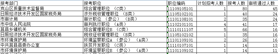 2016年日照市所屬的職位中,報考人數(shù)最多的職位是:東港區(qū)鄉(xiāng)鎮(zhèn)機關(guān)的綜合管理職位A (C類)、五蓮縣鄉(xiāng)鎮(zhèn)機關(guān)的綜合管理職位C (C類)、東港區(qū)石臼街道的綜合管理職位 (C類),報考人數(shù)均破200。