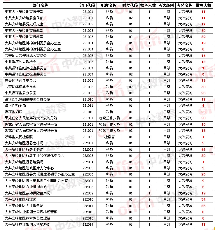 中公網(wǎng)校為參加2014年黑龍江省公務員考試的考生整理截止至5月18日早9點的大興安嶺考區(qū)繳費人數(shù),由于報名網(wǎng)站報名情況每30分鐘統(tǒng)計一次,數(shù)據(jù)可能會有細微差異,所有數(shù)據(jù)僅供大家參考。