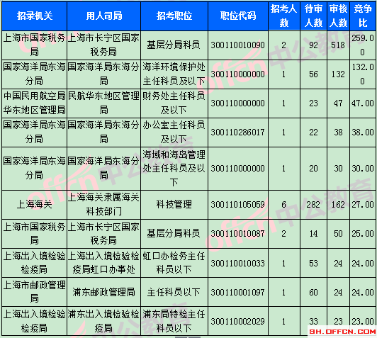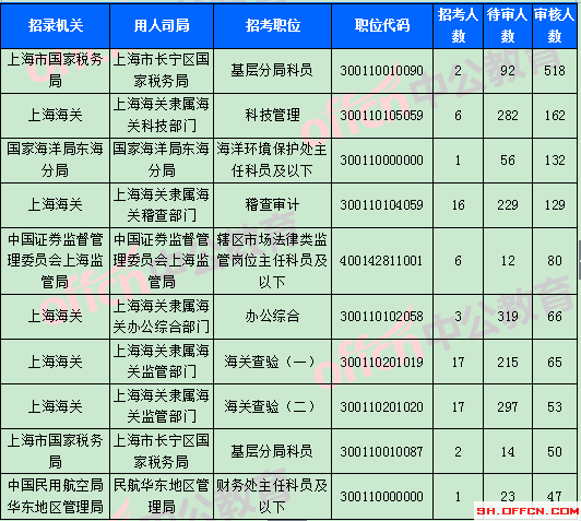 截止到1日9時,競爭比例的職位為上海市國家稅務局上海市長寧區(qū)國家稅務局基層分局科員一職,招錄2人,截止到1日9時通過人數(shù)為518人。報名通過審核人數(shù)前十的職位主要集中在上海市國家稅務局,上海海關(guān),國家海洋局東海分局等部門,具體信息如下: