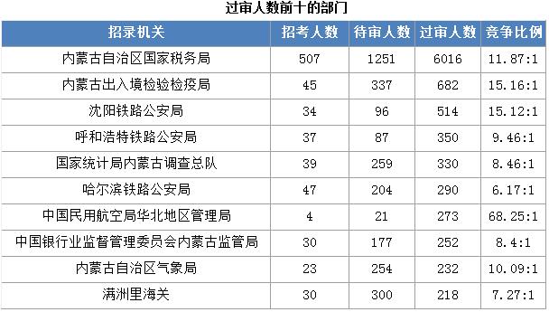 截止到2日16時,通過審核人數(shù)前三位的部門依次是:內蒙古自治區(qū)國家稅務局(過審6016人)、內蒙古出入境檢驗檢疫局(過審682人)、沈陽鐵路公安局(過審514人),三部門通過審核總人數(shù)達7212人,占通過審核總人數(shù)的70.3%。