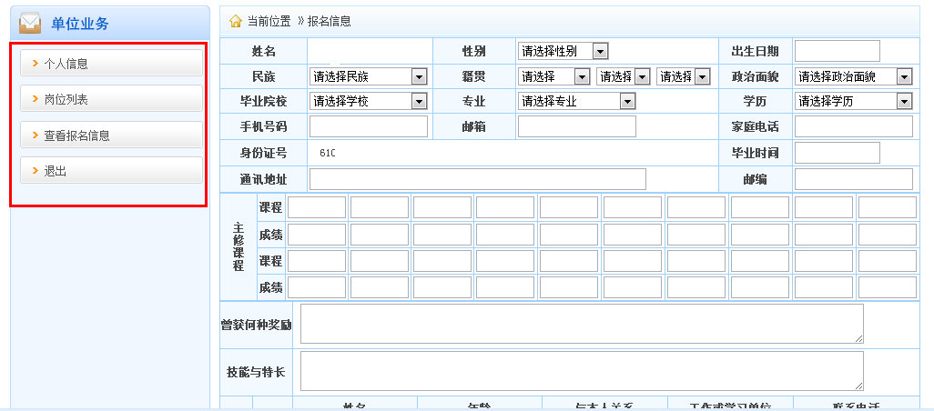 三:輸入報名信息。在報名信息列表里面有四行,個人信息-崗位列表-查看報名信息-退出。需要一步一步按照順序進(jìn)行填寫,所以請廣大考生慎重填寫。