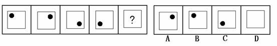 (答案:B。黑點(diǎn)在正方形中順時針移動。在第5個圖形中,應(yīng)該正好移動到左上角。)
