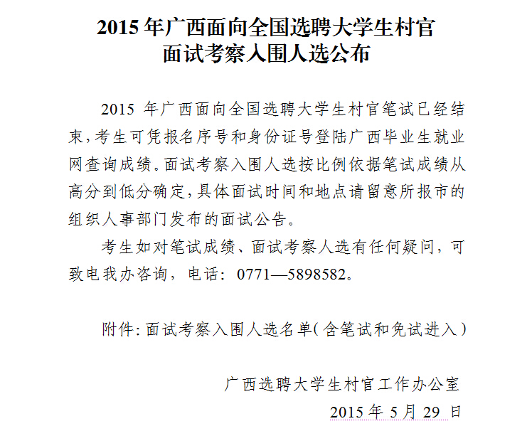 2015廣西大學(xué)生村官考試面試考察人選公布(面向全國)