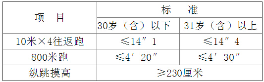 測評標準按照《關(guān)于印發(fā)公安機關(guān)錄用人民警察體能測評項目和標準(暫行)的通知》(人社部發(fā)〔2011〕48號)執(zhí)行。詳見下表: