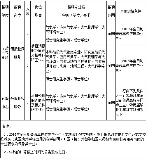 根據(jù)《寧波市事業(yè)單位公開招聘工作人員實施辦法》有關(guān)規(guī)定,經(jīng)浙江省氣象局、寧波市人力資源和社會局同意,寧波市氣象局下(直)屬單位寧波市氣象臺、寧波市氣象災(zāi)害應(yīng)急預(yù)警中心決定面向社會公開招聘事業(yè)編制工作人員3名?,F(xiàn)就有關(guān)事項公告如下: