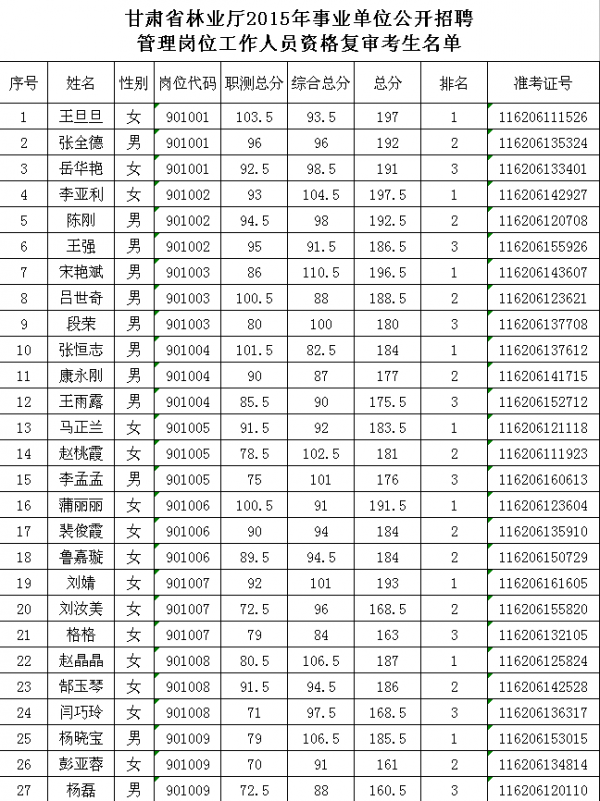 甘肅省林業(yè)廳2015年事業(yè)單位公開(kāi)招聘管理崗位工作人員(省直第九期)筆試工作已經(jīng)結(jié)束,現(xiàn)就資格復(fù)審有關(guān)事項(xiàng)通知如下: