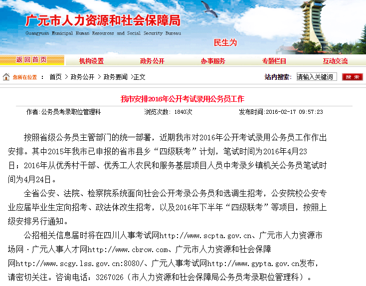 公招相關(guān)信息屆時將在四川人事考試網(wǎng)http://www.scpta.gov.cn、廣元市人力資源市場網(wǎng)·廣元人事人才網(wǎng)http://www.cbrcw.com、廣元市人力資源和社會網(wǎng)http://www.scgy.lss.gov.cn:8080/、廣元人事考試網(wǎng)http://www.gypta.gov.cn發(fā)布,請密切關(guān)注。咨詢電話:3267026(市人力資源和社會局公務(wù)員考錄職位管理科)。