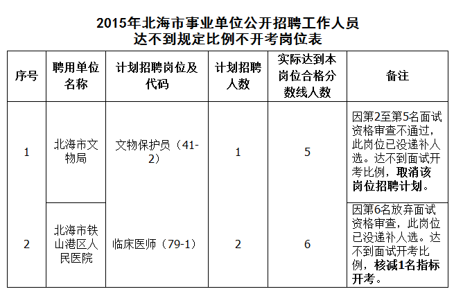 2015年北海市81個(gè)事業(yè)單位159個(gè)崗位計(jì)劃公開招聘工作人員指標(biāo)204名,筆試因無人報(bào)考或達(dá)不到開考比例取消21個(gè)崗位、核減指標(biāo)33名,筆試實(shí)際開考138個(gè)崗位(171名指標(biāo))。根據(jù)《2015年北海市事業(yè)單位公開招聘工作人員公告》有關(guān)規(guī)定,因部分崗位筆試合格分?jǐn)?shù)線上線考生達(dá)不到面試規(guī)定比例面試不開考的崗位6個(gè)、指標(biāo)6名;減少指標(biāo)開考的崗位3個(gè)、指標(biāo)3名。面試資格審查不通過取消開考的崗位1個(gè)、指標(biāo)1名;減少指標(biāo)開考的崗位1個(gè)、指標(biāo)1名。面試實(shí)際開考崗位131個(gè)、160名指標(biāo)?,F(xiàn)將面試資格審查不通過達(dá)不到規(guī)定比例而取消和核減聘用指標(biāo)公告如下: