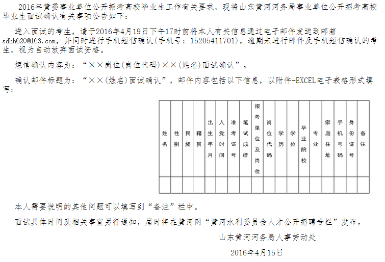 原標(biāo)題:2016年山東黃河河務(wù)局事業(yè)單位招考高校畢業(yè)生面試確認(rèn)公告